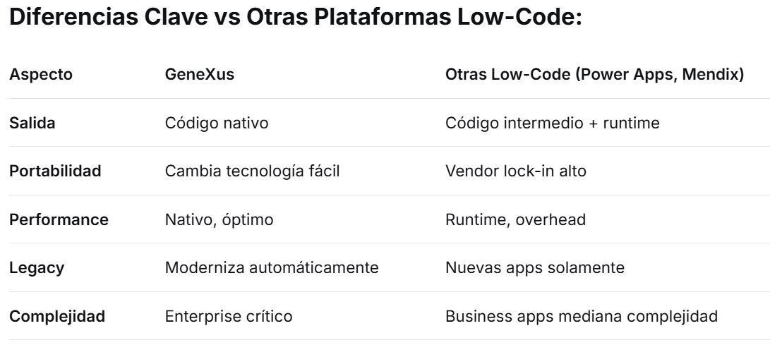 GeneXus es una de las herramientas low-code más potentes y veteranas del mercado, con una filosofía única que la distingue de otras plataformas.